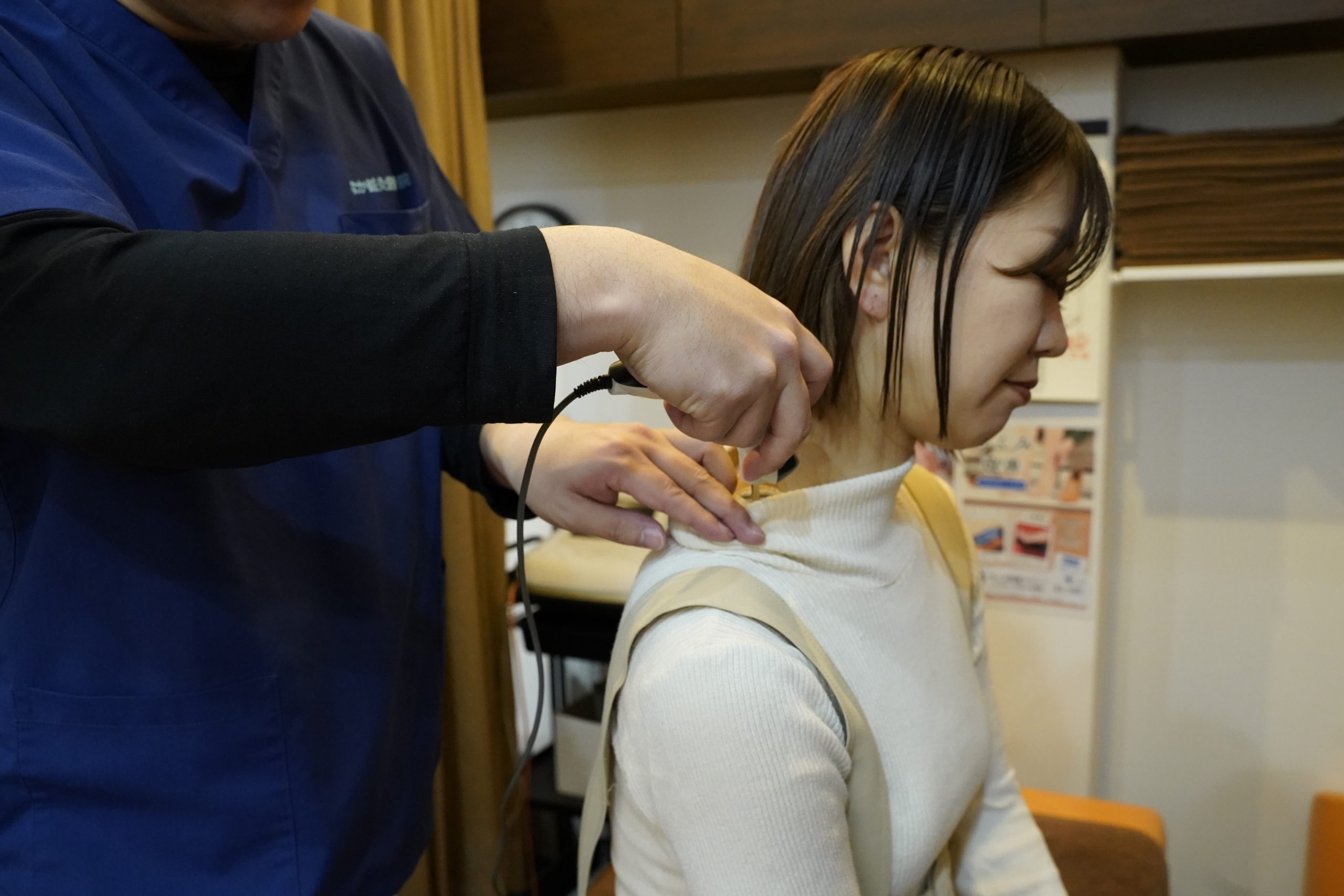 内容としては施術前に痛み・動かしにくさの検査を行い、専用の機器を用い直接原因箇所に向けて治療を行った後、再度検査を行いつつ変化を確認していきます。